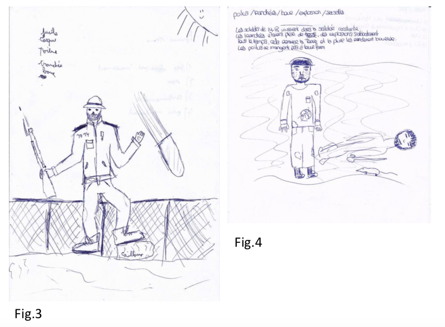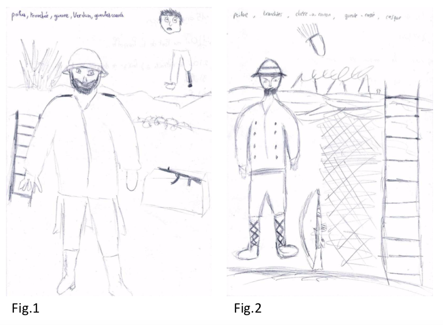 Dans un second temps, nous avons rencontré notre population adolescente (N=64) en les invitant à participer à une tâche d’association libre (Bardin, 1977/2001) afin de cerner le souvenir qu’ils ont élaboré concernant le soldat de 14-18. Pour ce faire, les élèves ont été divisés en deux groupes. Dans le premier, nous avons distribué des planches de BD. Dans le second cas, aucun support n'a été fourni. Puis, nous avons demandé à tous les élèves d’écrire ce qui, selon eux, caractérisaient le soldat de la Grande Guerre. Nous leur avons également donné l'occasion d’investir la tâche en dessinant ce soldat (Uzzell & Blud, 2004). Cette méthode permet de laisser s’exprimer les élèves plus librement. De plus, elle est cohérente avec la particularité (texte/image) du corpus de BD et nous permet d’envisager les dessins comme des post-mémoires, au même titre que les albums. Nous pourrons in fine avoir à une compréhension globale des thématiques issues des BD, les écrits et les dessins des adolescents.