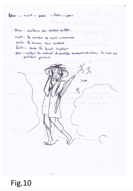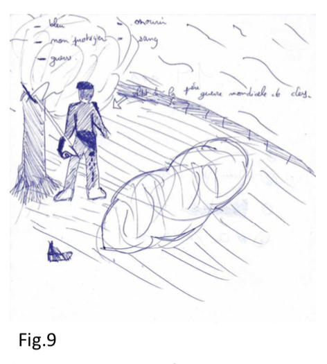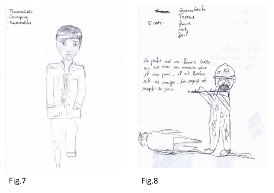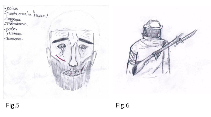 En nous attardant plus précisément sur les détails, nous remarquons que la quasi-totalité des dessins les visages sont tristes. Dans les cas où les visages ont l'air serein, nous remarquons que c’est un soldat décédé qui est dessiné, comme libéré d'un fardeau (Fig.4, Fig.5). La dimension des fusillés pour l’exemple apparaît clairement dans une phrase qui accompagne un dessin : « Le poilu est un homme triste qui doit tuer ses ennemis sinon il sera puni » (Fig.8). Le soldat est contraint, s’il est amené à tuer c’est pour défendre sa vie et sa patrie. Le soldat est majoritairement meurtri tant physiquement que psychiquement : des blessures au bras, aux jambes, aux visages. La dimension du combattant est modelée par le caractère victimaire du soldat. Des cicatrices rouges (au stylo à bille) marquent la dureté de ce qu’il subit (Fig.5). Dans son regard, nous pouvons lire de la détresse, de la fatigue et de la peur. Ce n’est pas un soldat mais un combattant traumatisé qui est représenté.