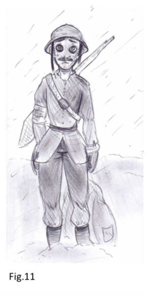 De manière générale, le soldat est barbu ou mal rasé. La saleté et l’usure de son uniforme sont des détails qui indiquent une temporalité longue et un manque d’hygiène. Cela fait sans doute plusieurs mois ou plusieurs années qu’il vit dans les tranchées. La position dans laquelle il est dessiné indique qu’il n’apparait pas comme un acteur du conflit. C’est-à-dire qu’il est souvent figuré seul, debout et de face sur les dessins, sa position est statique (Fig.1, Fig.2, Fig.4, Fig.6, Fig.7, Fig.9, Fig.10, Fig.11). Telle une situation de portrait, le soldat prend la pose et regarde fixement droit devant lui (Fig.7, Fig.9). Le personnage n’est pas en train de se battre, il est passif. Le fusil est posé à côté de lui ou accroché sur son dos (Fig.11). Seulement deux d'entre eux tirent avec leurs armes (Fig.3, Fig.8). Ces éléments sont une manière de présenter le soldat comme un militaire car les dessins rappellent les portraits photographiques de l'époque.