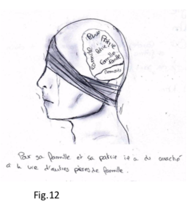 Les productions picturales renvoient aussi à une dimension non belliqueuse. Le soldat n'a que très rarement son fusil à la main, il est blessé, et lorsqu’il tue, le regret et la folie le rongent de l'intérieur. Cet élément est frappant dans Fig.12, où les remords sont littéralement écrits dans le crâne du soldat et accompagnés par les concepts de famille et de patrie. Comme s'ils devaient coexister dans son esprit, malgré leur incompatibilité. Des larmes sur leurs joues peuvent évoquer l’inhalation du gaz moutarde la culpabilité qui le ronge. « Pour sa famille et sa patrie il a dû arracher à la vie à d’autres pères de famille » (Fig.12). Cela renforce l'image d'une guerre inutile et violente tout en donnant une conscience morale aux acteurs du conflit. La précision des émotions et le trait renforcé pour illustrer les yeux, traduisent le désir de marquer les souffrances que ces civils ont subies.